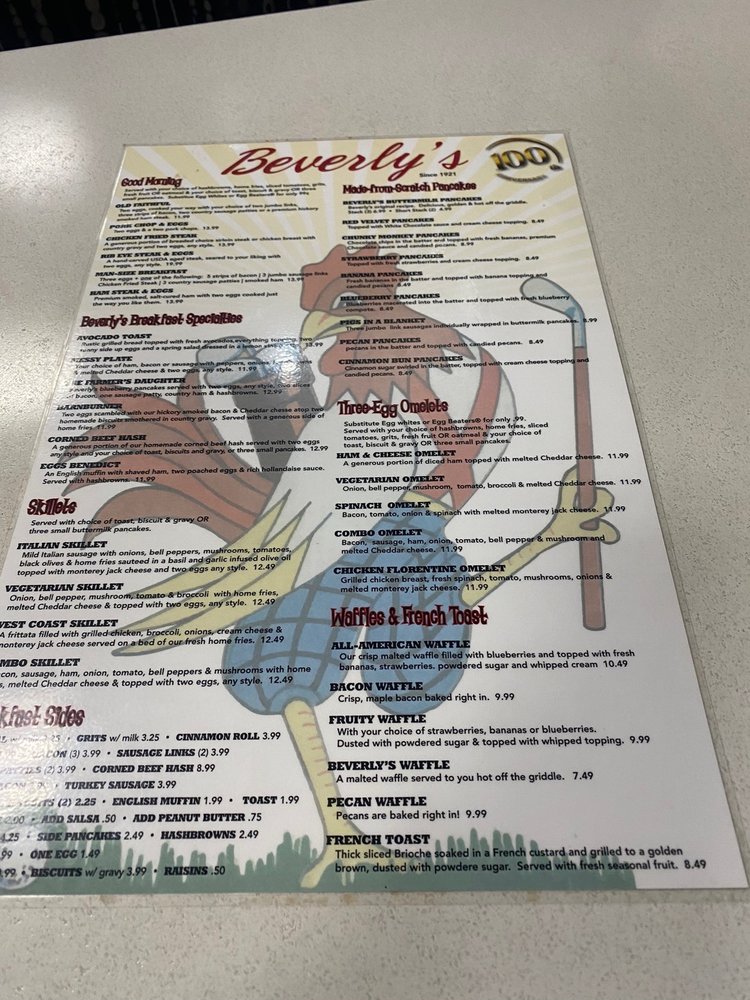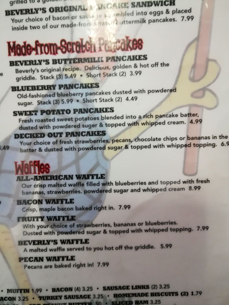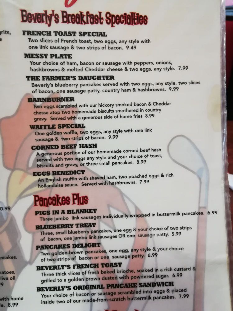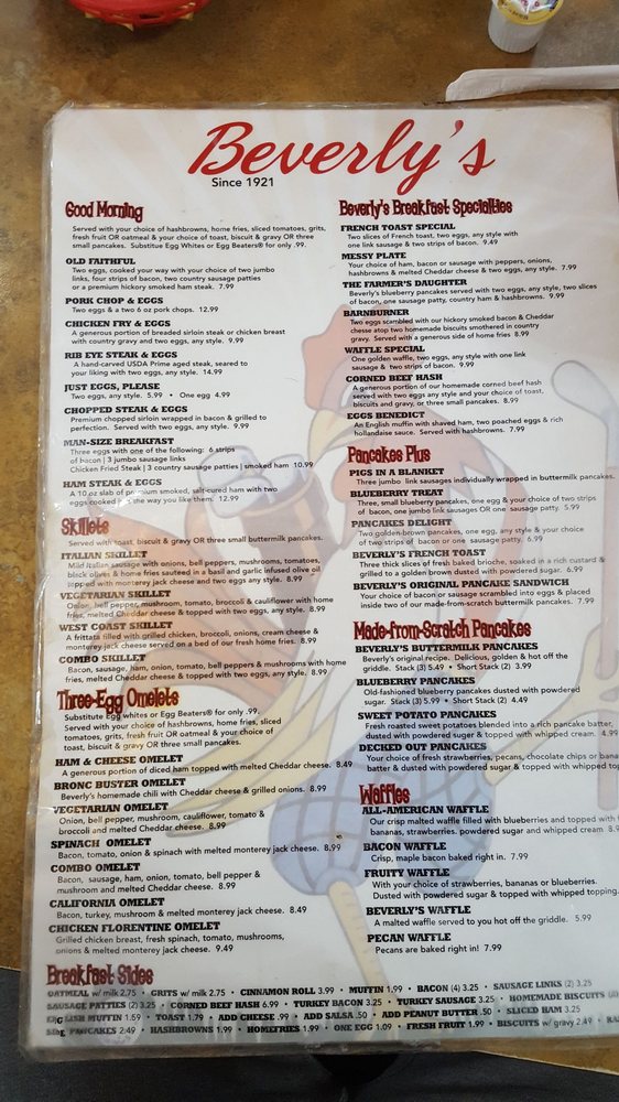 Introducing the menu at Beverly's Pancake House, a breakfast and brunch spot located in Oklahoma City. Known for their made-from-scratch pancakes, including favorites like the Beverlys Buttermilk Pancakes and Chunky Monkey Pancakes. Their breakfast specialties like Avocado Toast and The Farmers Daughter offer a unique twist on classic dishes. Customers rave about the delicious food, with some highlighting the pancakes as a standout. While service may have been slightly lacking for some, the overall dining experience at Beverly's Pancake House seems to be positive. With a variety of options to choose from and a cozy atmosphere, it's definitely worth a visit for a tasty breakfast or brunch.