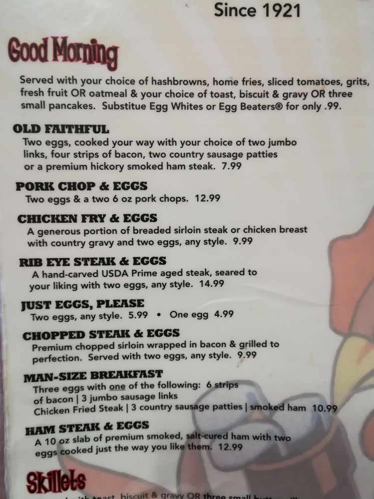 Three eggs + one of the following: 5 strips of bacon | 3 jumbo sausage linksChicken Fried Steak | 3 country sausage patties | smoked ham