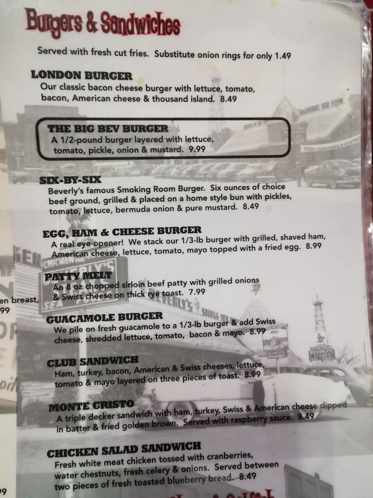 Beverlys famous Smoking Room Burger. Six ounces of choice beef ground, grilled & placed on a home style bun with pickles, tomato, lettuce, bermuda onion & pure mustard